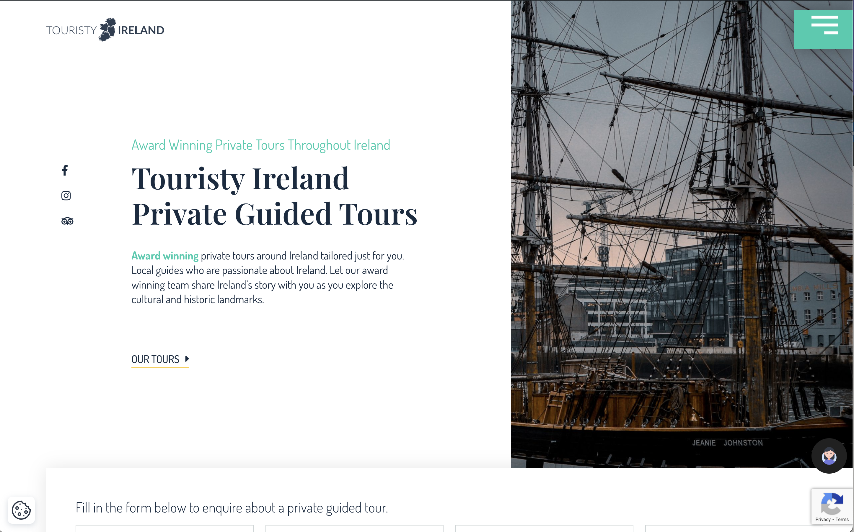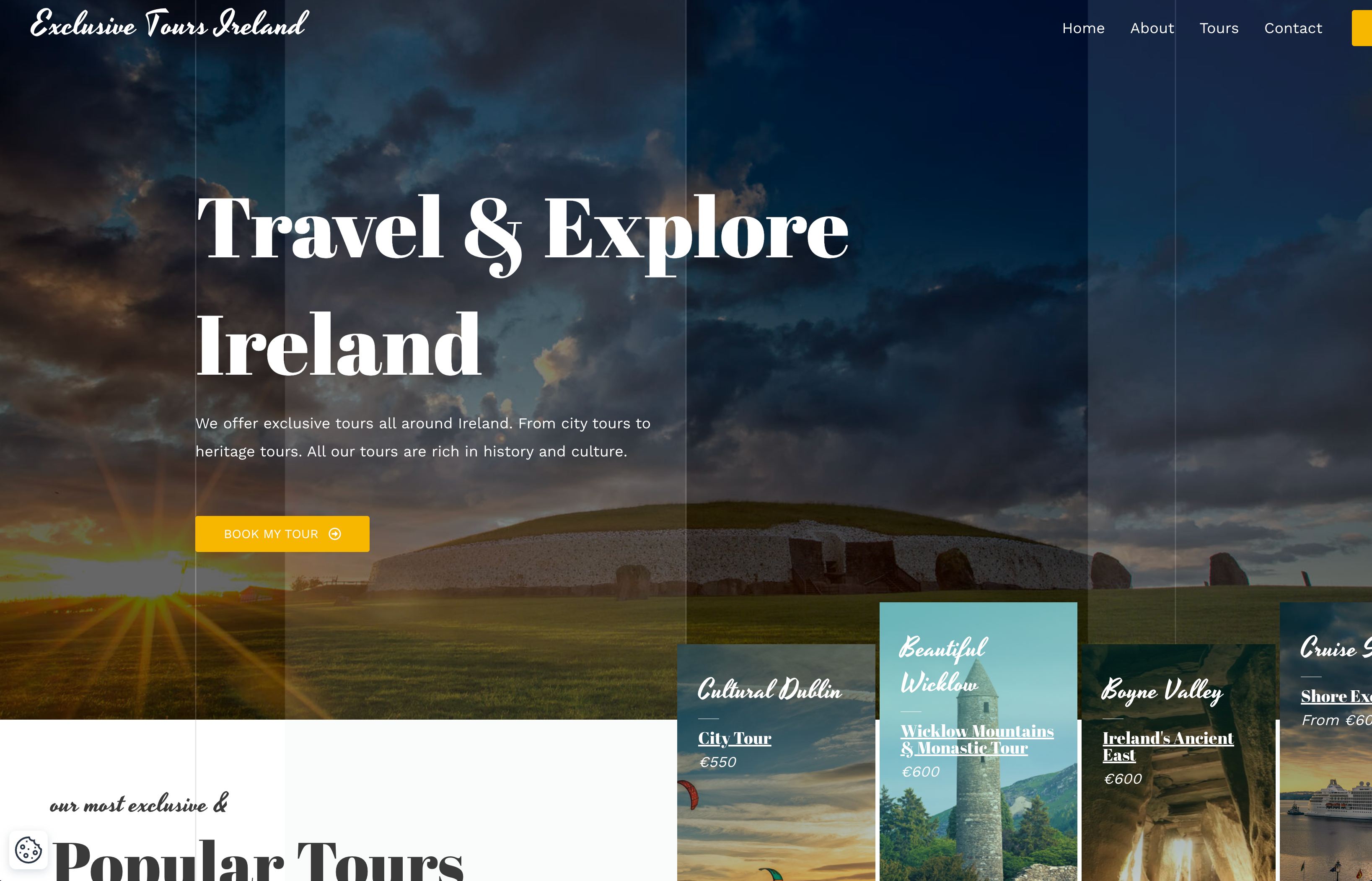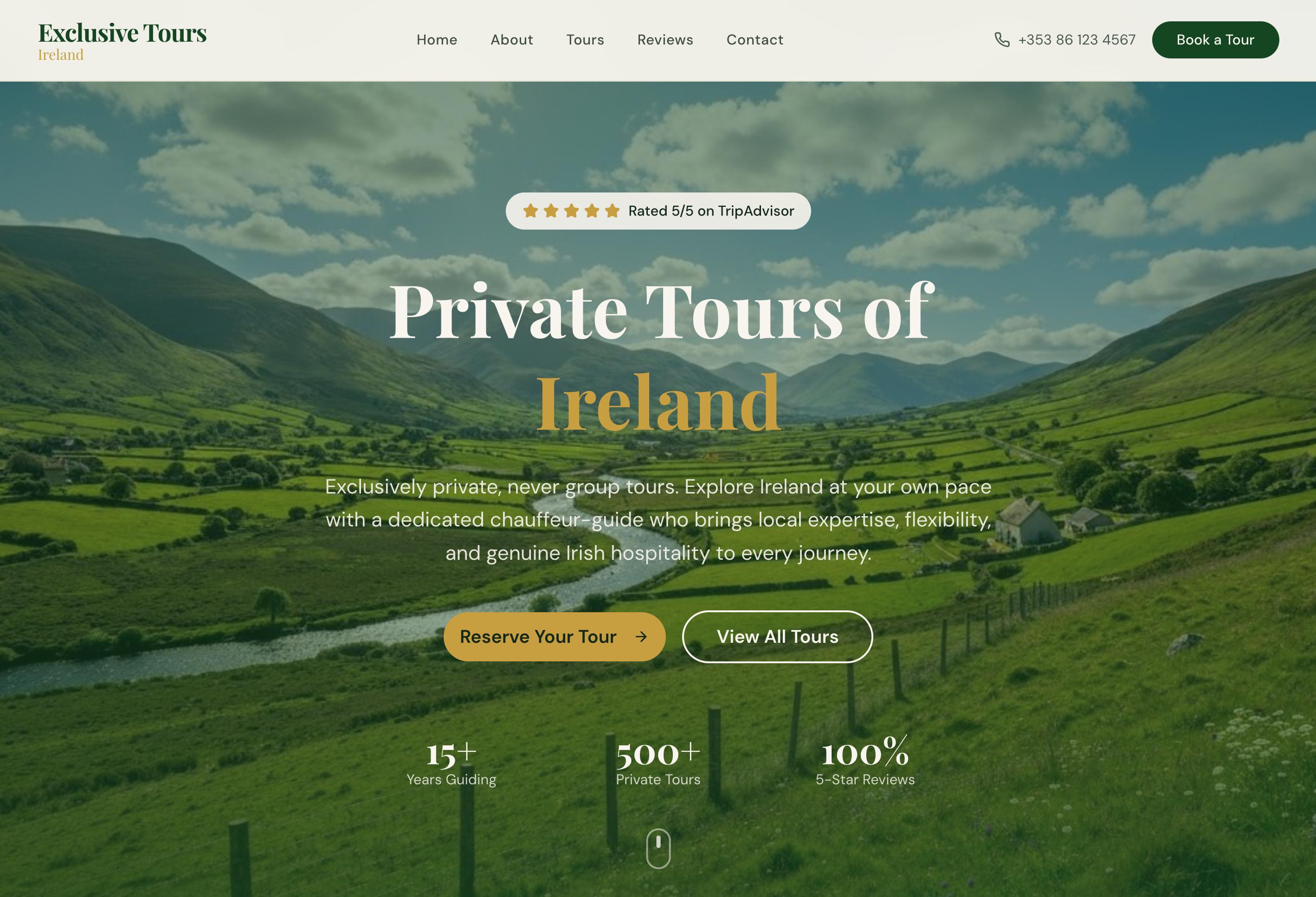 Stunning Irish landscape hero, elegant typography, clear stats, modern booking CTAs, premium brand feel
